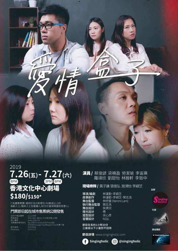 Singingholic 為非牟利註冊團體,致力推動青年藝術創作,本年度將於2019年3月25-31日,假香港兆基創意書院多媒體劇場,6月27-29日假牛池灣文娛中心文娛廳,及7月25-27日假文化中心劇場進行舞台劇演出,現招募台前幕後人員參與,歡迎對舞台有興趣之人士參與。